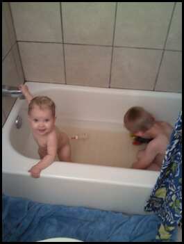 He begged me to let him climb in the back of the tub with Eliana to wait his turn. And she loved having her brother in the bathtub! It was like putting extra hot fudge and whipped cream on the sundae:) She crawled around trying to steal his car and shrieked at him happily. It was pretty cute!