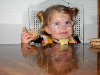Yesterday, Eliana was sitting across from me eating one of her new favorite foods: PB&J. She loves to be liberated from her highchair to sit in a big chair like a big girl. And...she looked so stinkin' cute as usual that I had to break out the camera:)